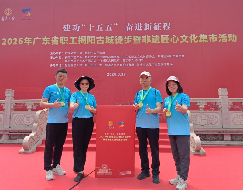 在今年全国两会期间广东省代表团开放团组活动中,省委书记黄坤明向全国人民发出到揭阳逛古城品美食的邀约。3月27日,2026年广东省职工揭阳古城徒步暨非遗匠心文化集市活动在揭阳市举行。本次活动由广东省总工会与揭阳市人民政府共同主办,以“建功‘十五五’ 奋进新征程”为主题,旨在大力弘扬劳模精神、劳动精神、工匠精神,创新职工文体融合模式,增强职工身体素质,凝聚职工奋进力量,省总工会党组书记、常务副主席温文星,揭阳市委书记、市人大常委会主任曾风保,揭阳市委副书记、市长曲晓杰,省总工会二级巡视员谢岩梅等嘉宾出席活动启动仪式。来自全省及港澳工会等180多家基层工会共约850名职工参加了活动,共同体验了这场5公里的活力文化之旅,触摸千年古城的厚重历史,感受当代古城的崭新面貌。我校工会组队参加并顺利完成了这次活动。